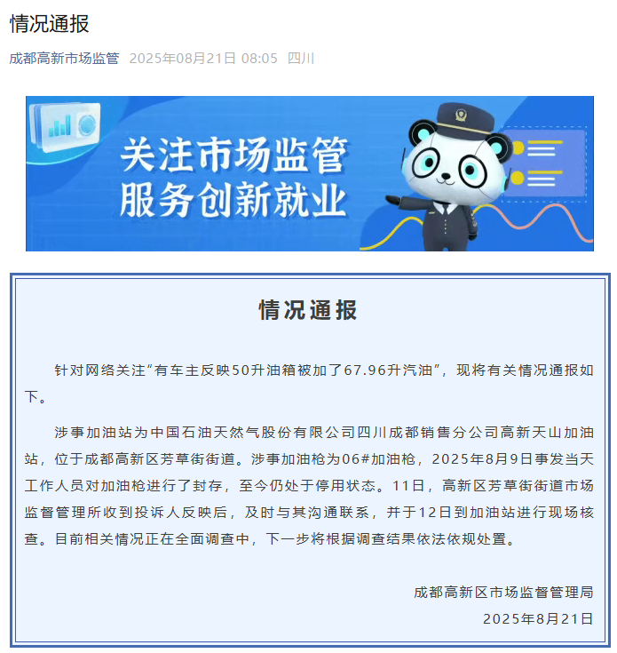 涉事加油站为中国石油天然气股份有限公司四川成都销售分公司高新天山加油站,位于成都高新区芳草街街道。涉事加油枪为06#加油枪,2025年8月9日事发当天工作人员对加油枪进行了封存,至今仍处于停用状态。11日,高新区芳草街街道市场监督管理所收到投诉人反映后,及时与其沟通联系,并于12日到加油站进行现场核查。目前相关情况正在全面调查中,下一步将根据调查结果依法依规处置。