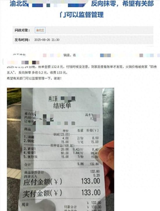 近日,重庆渝北区,网友反映一家火锅店反向抹零,其消费了 132.8元,到家后查看账单,发现商家四舍五入收133元,希望相关部门能进行监督管理。