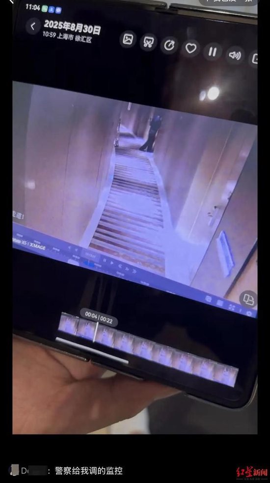 红星新闻记者注意到,网友在帖子下发布了一张照片,并配文称“警察给我调的监控”。照片中显示,一部手机正在播放监控画面,画面中可以看到一名身穿深色衣服的人正从走廊进入房间。该帖的定位显示,地点为上海中星铂尔曼大酒店。红星新闻记者尝试联系该网友,但尚未收到回复。