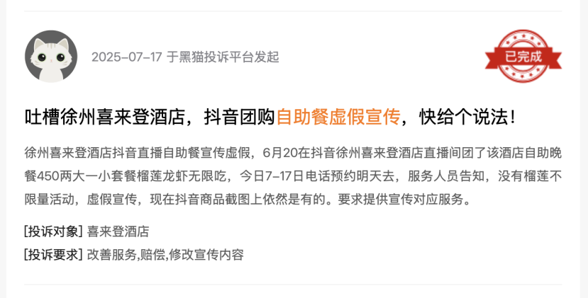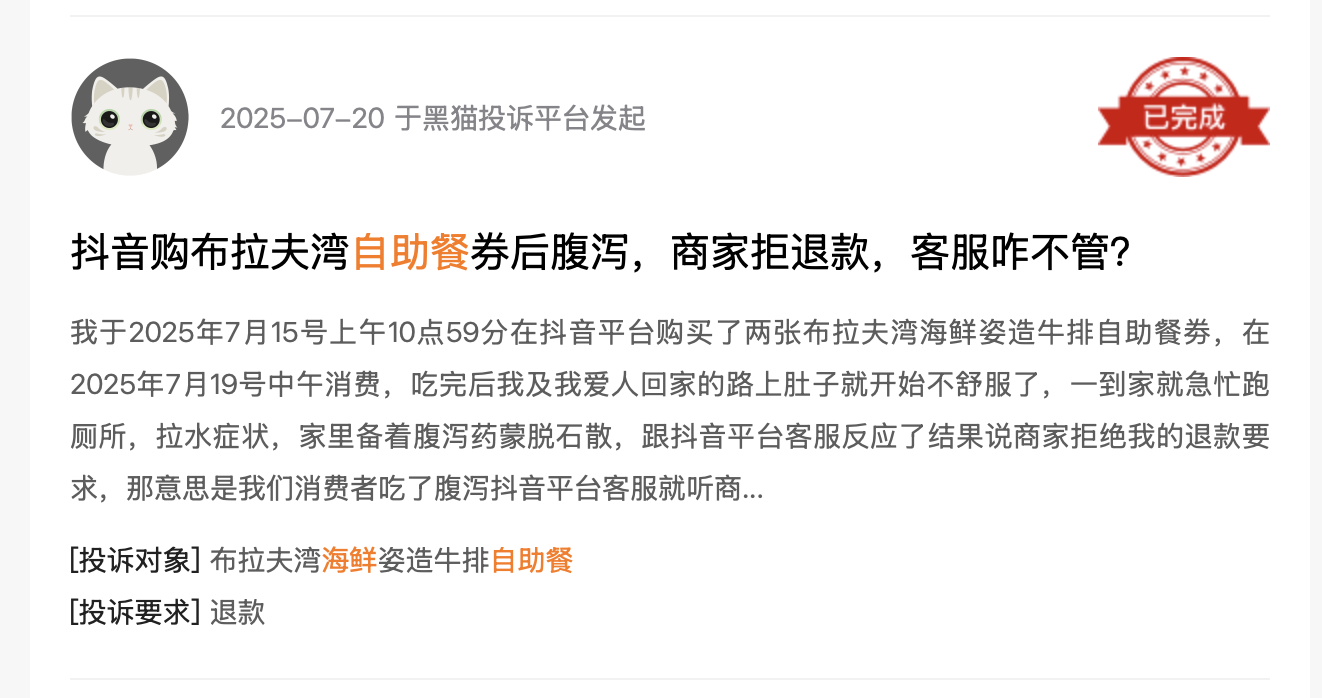 在黑猫投诉平台上,自助餐相关的消费纠纷屡见不鲜,除常见的规则不透明、押金退款问题外,食品安全与虚假宣传更是重中之重。以下是几个典型投诉案例: