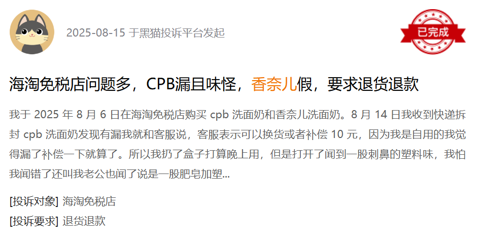 不过,也有成功维权的案例:一位消费者在海淘免税店购买 cpb 洗面奶和香奈儿洗面奶,收到后却发现可能是假货。她第一时间反馈给客服,商家表示可以换货或者补偿 10 元。然而,消费者找到了平台对于货物进行鉴别,发现确实是假货,此前已经购买过多次产品。该消费者并未放弃维权,而是在黑猫投诉平台提交了视频和图片证据,详细说明情况,最终成功拿回退款。