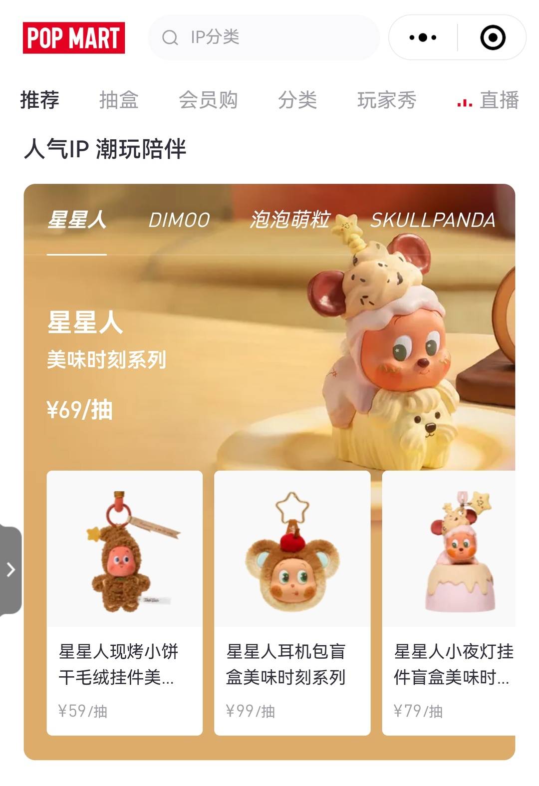 9月29日晚10点,泡泡玛特正式发售“星星人美味时刻系列”。此次发售的新品,包含星星人美味时刻系列手办及衍生周边毛绒挂件、抱枕等,其中毛绒挂件成为此次新品关注的焦点,售价59元一个,一共是6个常规款,一个隐藏款。据悉,此次星星人的毛绒挂件也是首次低于79元。