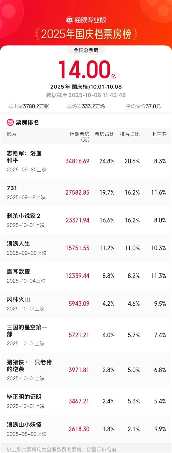 快科技10月6日消息,据猫眼专业版数据,截至10月6日11时42分,2025年国庆档档期票房破14亿元。