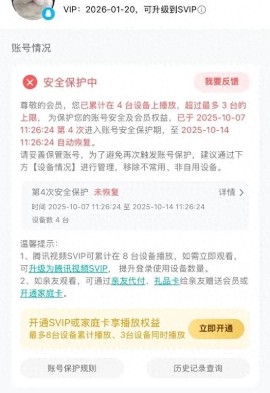 VIP账号因登录设备数量超限被封?腾讯视频:为防止黑灰产
