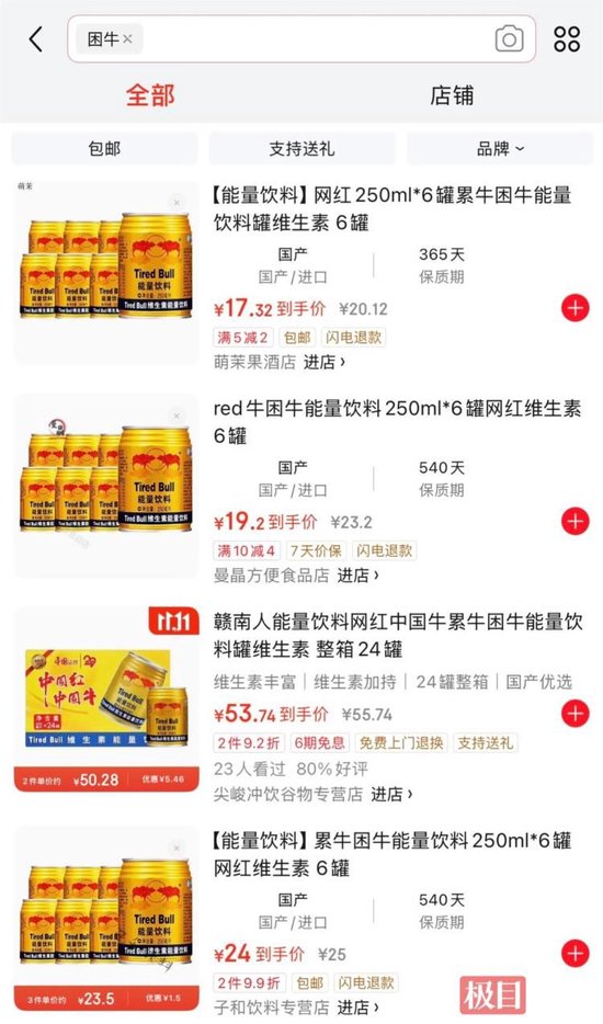 与此同时,记者同时在多个网购平台搜索发现,名为“困牛”“累牛”的功能饮料数量众多,且图示显示其包装均与红牛饮料相似。部分销售商家称,所售“困牛”“累牛”为资质齐全的正品维生素能量饮品。
