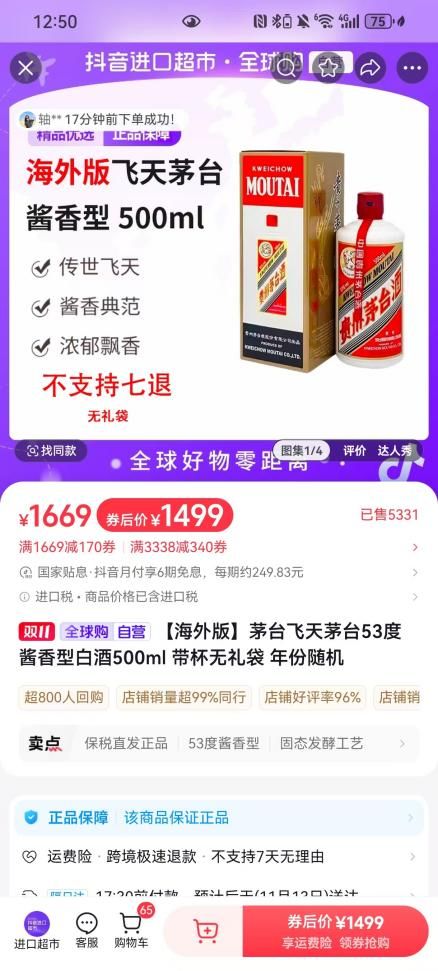 值得注意的是,就在“双11”前夕,抖音上的超低价海外版飞天茅台却搜索不到购买链接了。搜索出的海外版茅台,价格大多在1466元/瓶~1699元/瓶。