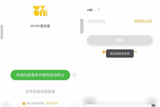 扫码后,页面提供两个选项:一是“快捷注册登录并授权自动积分”,二是“仅手机验证码登录”。记者不愿注册会员,就选择手机验证码登录。输入手机号后,页面显示“验证码发送失败”。