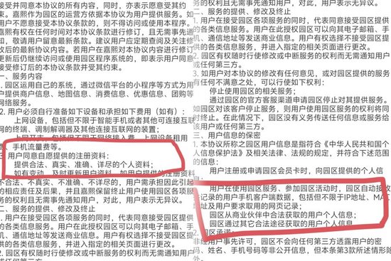记者截屏后发现,《用户协议》含有“用户同意自愿提供的注册资料:提供合法、真实、准确、详尽的个人资料” “用户在使用园区服务、参加园区活动时,园区自动接收并记录的用户手机客户端数据,包括但不限于IP地址、MAC地址及用户要求取用的网页记录”等内容。事实上,记者并非自愿提供手机号,也不愿园区记录手机客户端数据——可是,为了注册成功,别无选择。