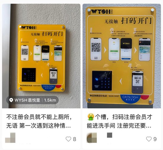 “我在园区里的餐厅用餐,期间想上厕所,没想到园区的厕所用的是密码锁,要求注册会员后才能扫码开门,这合理吗?”最近,读者易女士向解放日报·上观新闻记者反映其在WYSH翡悦里(以下简称“翡悦里”或“园区”)的如厕遭遇。