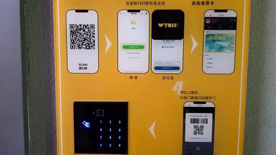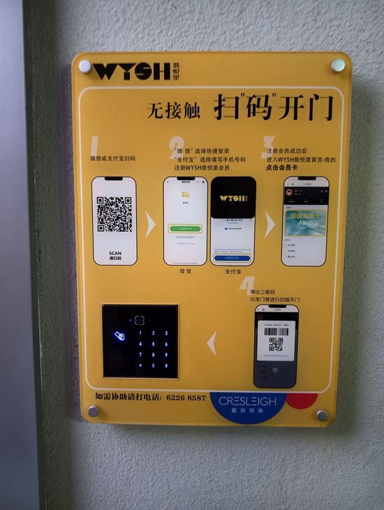 此时,男女厕所的门都关着,推不开。门口有一块指示牌,介绍了开门的4个环节:微信或支付宝扫码-注册翡悦里会员-注册成功后选择“我的会员卡”-弹出二维码,对准门禁扫描开门。