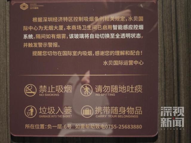 据深视新闻报道,商场公告说明,此处已启用智能感应控烟系统,如果检测到烟雾,隔间玻璃便会自动转为全透明状态,同时触发警报警示。记者在现场实测后发现,一旦有人在隔间内吸烟,烟雾警报器便会当即触发,并持续鸣响提醒。