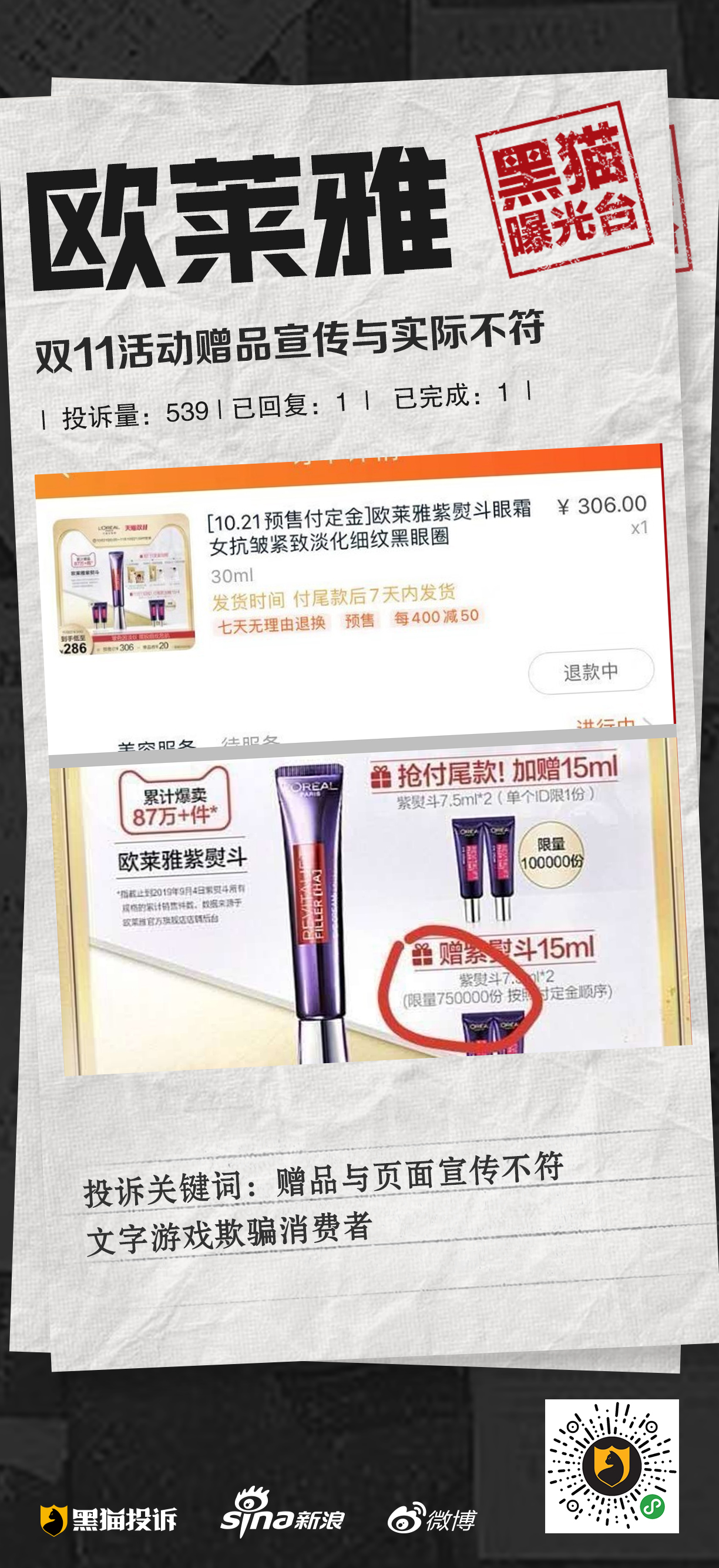 【黑猫曝光台】欧莱雅 双11活动赠品宣传与实际不符