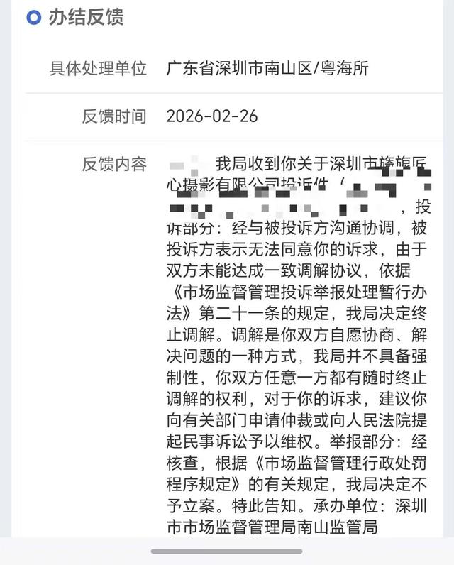 小李称,她将此事向深圳市相关部门进行了投诉举报,但深圳市市场监督管理局南山监管所于2月26日回复称,“投诉部分,由于双方未能达成一致调解协议,我局决定终止调解。关于举报部分:经核查,根据《市场监督管理行政处罚程序规定》的有关规定,我局决定不予立案。”