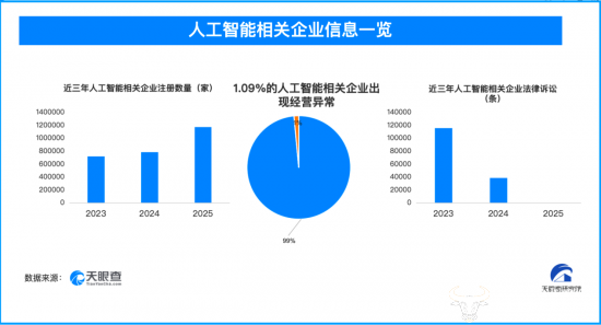 天眼查天眼风险显示,从事人工智能相关业务的企业中,1.99%的相关企业曾出现法律诉讼,1.09%的相关企业曾出现经营异常,0.38%的相关企业曾出现行政处罚。据天眼查深度风险数据显示,5300余家人工智能相关企业存在被执行人信息,占比0.10%。