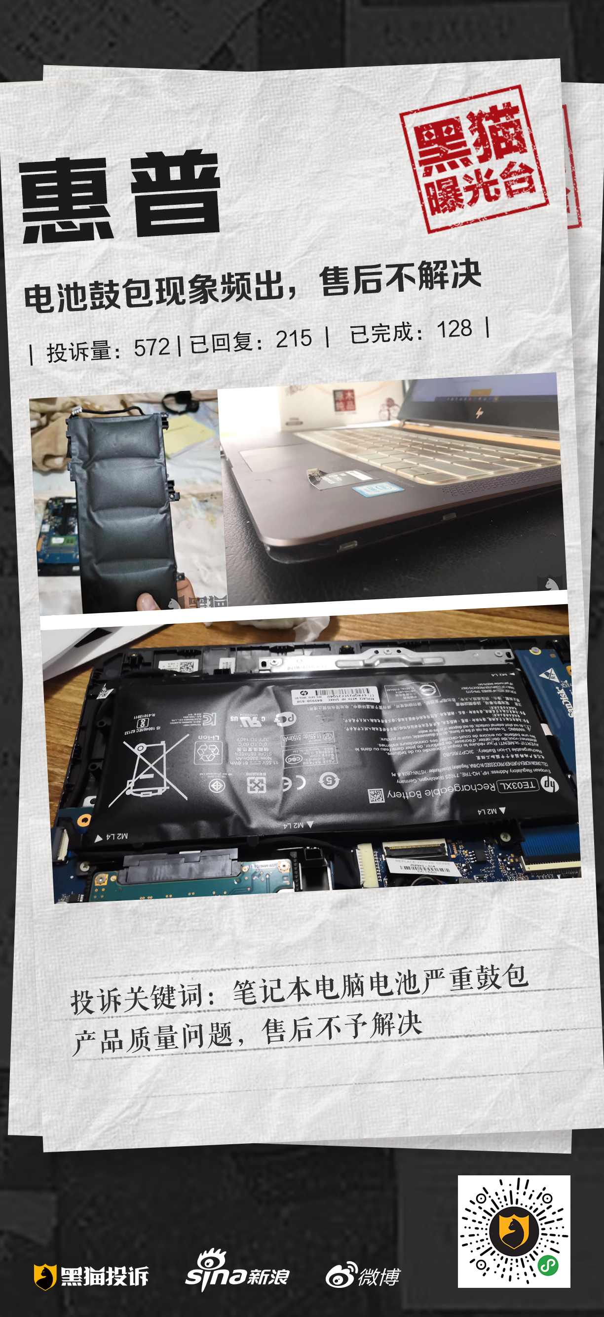 【黑猫曝光台】惠普电脑电池严重鼓包,售后不解决
