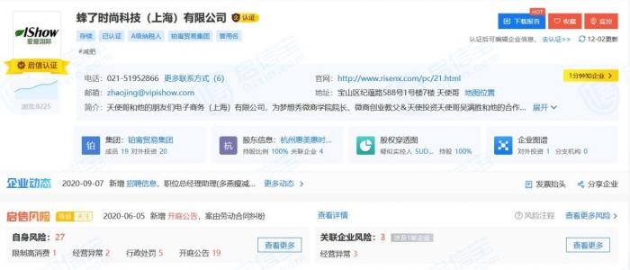 启信宝信息显示,“蜂了时尚科技(上海)有限公司”成立于2013年7月8日,注册资本金5000万元,为杭州惠美惠时尚科技有限公司100%控股的子公司。21世纪经济报道注意到,该公司成立七年来,屡次因“虚假宣传”遭到工商市场部门的处罚,累计罚款金额达37.5万元。