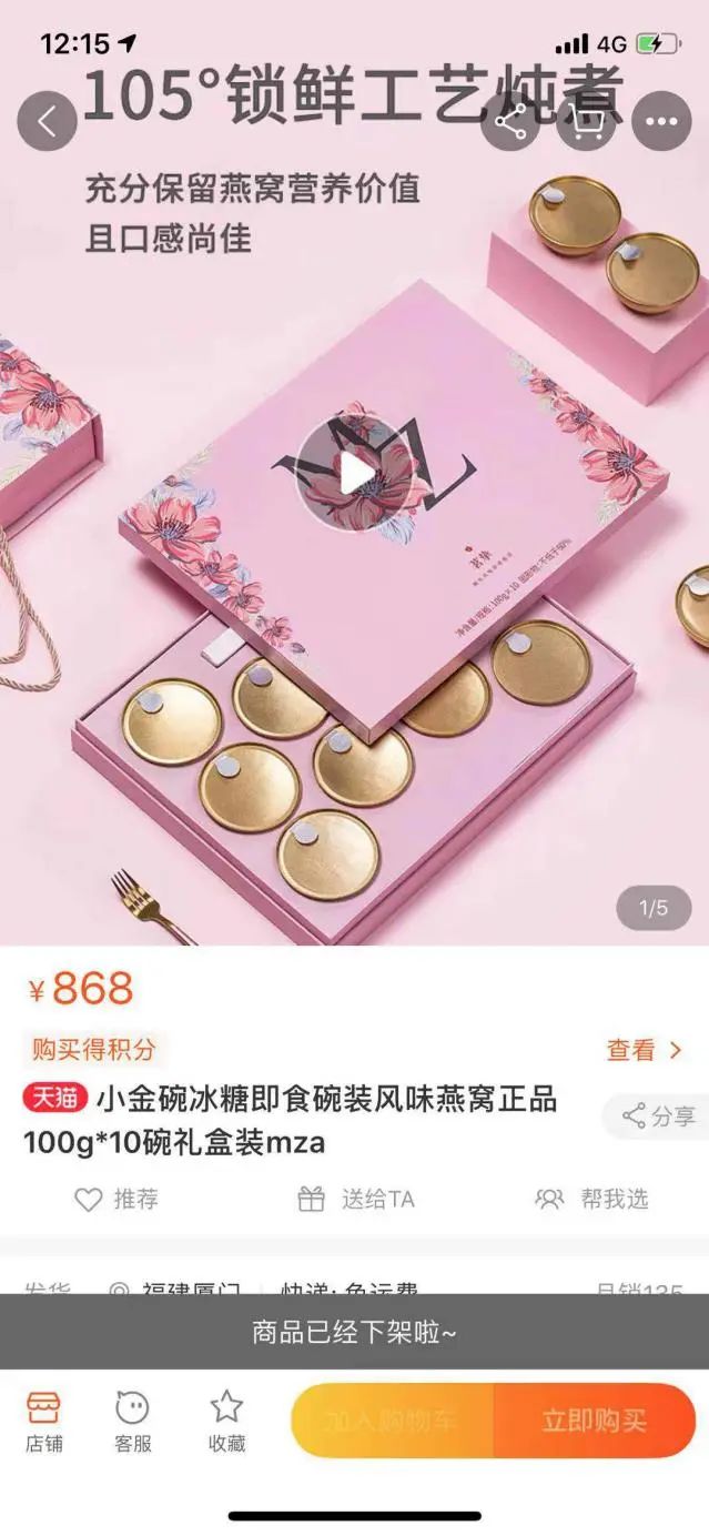 “茗挚旗舰店”多款燕窝产品均已下架。天猫网店图