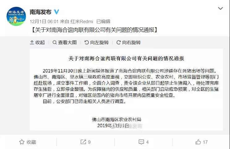 据南海区政府介绍,目前已在全区对生猪屠宰厂进行排查,同时组织五个专项执法检查组,分赴各镇(街道)开展执法监督检查。市场监管部门对南海辖区范围的猪肉经营市场开展全面排查,及时发现和处置问题肉品。经排查,目前暂未发现相关问题。