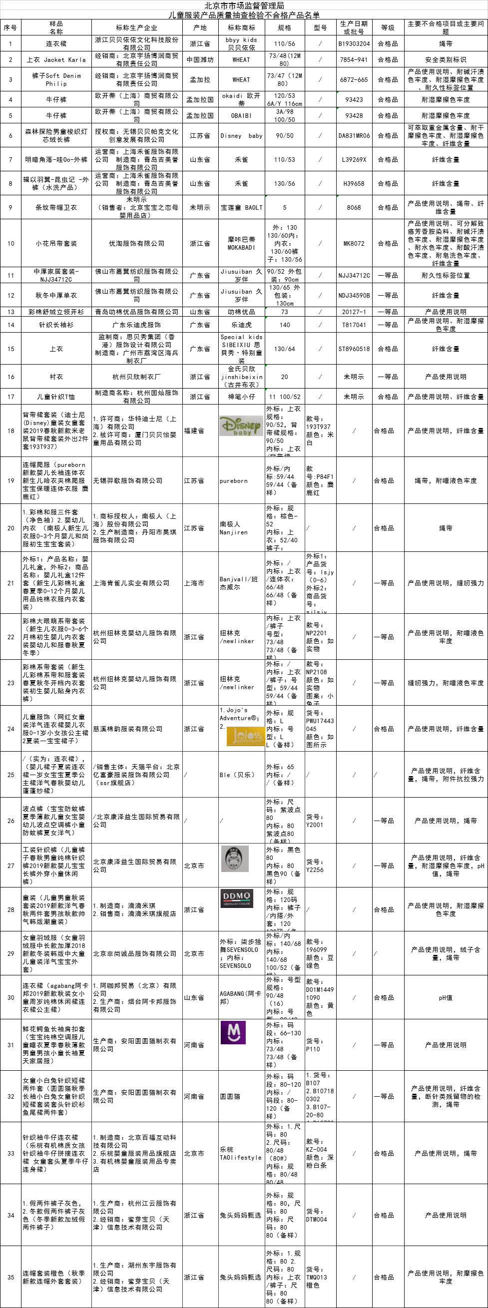 北京市市场监管局提醒消费者,在本次儿童服装产品质量抽查检验中,北京市市场监督管理局发现部分产品存在质量问题且通过产品标称的企业地址及联系方式无法与标称生产企业取得联系,北京市市场监督管理局建议消费者谨慎购买下列标称企业的产品,具体名单如下: