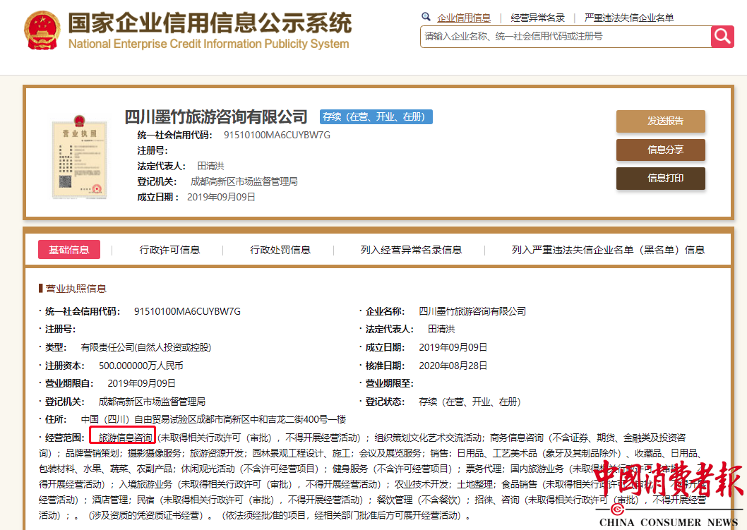 记者从国家企业信用信息公示系统查询到,“寄居蟹”运营公司四川墨竹旅游咨询有限公司成立于2019年9月9日,注册资本500万元,注册地在成都高新区,主要从事“旅游信息咨询”等服务。目前公司处于正常“存续”状态。