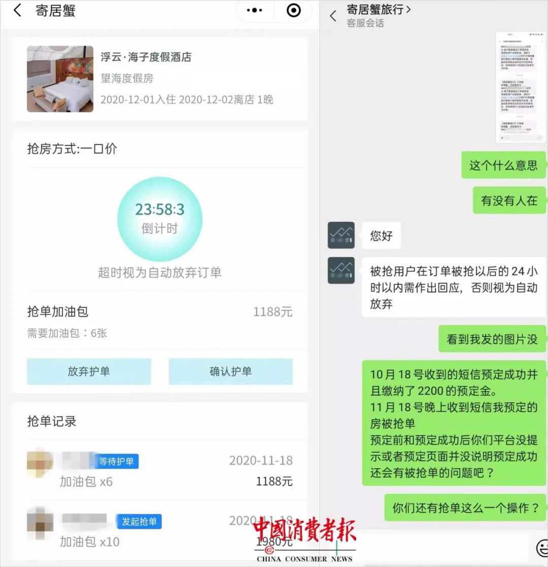 在“寄居蟹”订好的房间支付6倍保证金还要加价“护单” !消费者质疑