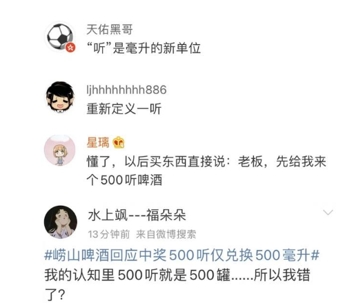 原标题:听=毫升?网友炸锅!崂山啤酒再回应中奖500听事件:承认工作不严谨,印刷错误