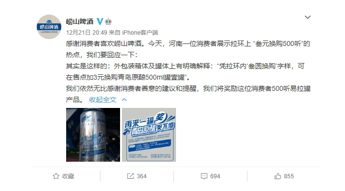 崂山啤酒一开始回应称500听是指500毫升,12月21日又回应将奖励消费者500听。