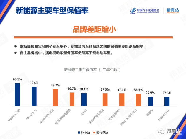 另据中国汽车流通协会和精真估联合发布的《2020年10月中国汽车保值率研究报告》,3年车龄的新能源二手车保值率前三名分别为Model X 75D(68.1%)、Model S 75(56.6%)、宝马X1插电混动(49.7%),而排在第4-8位的车型保值率不到40%,排第9-10位的甚至不到30%。