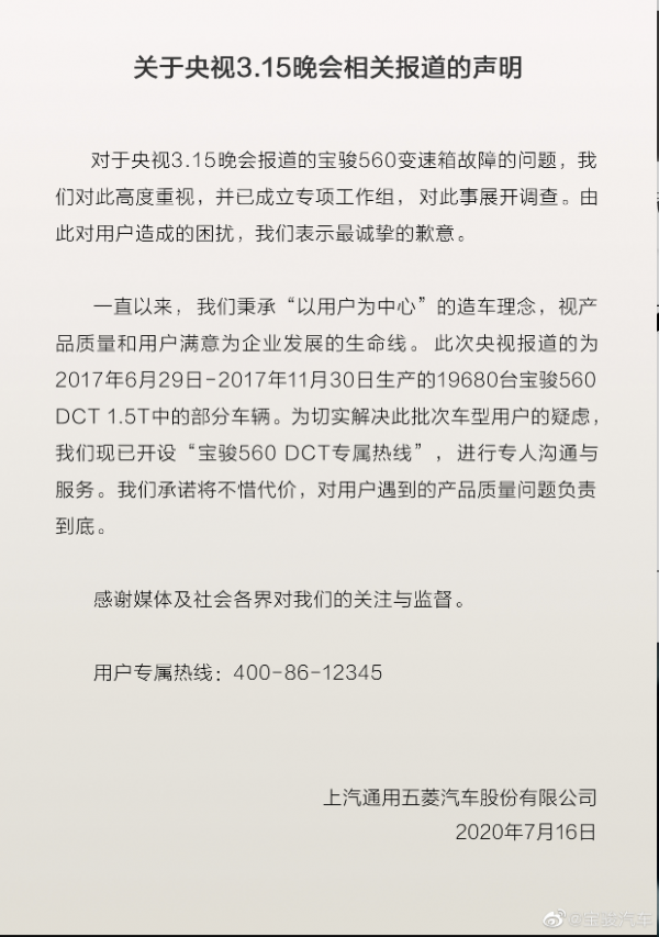 “已关注到央视的报道。目前,我们已经成立了专项工作组,后续调查结果将在上汽通用五菱的官方微信公众号和微博中公布,感谢关注。”7月16日晚间,被央视“315晚会”点名后,上汽通用五菱官方对记者回复到。