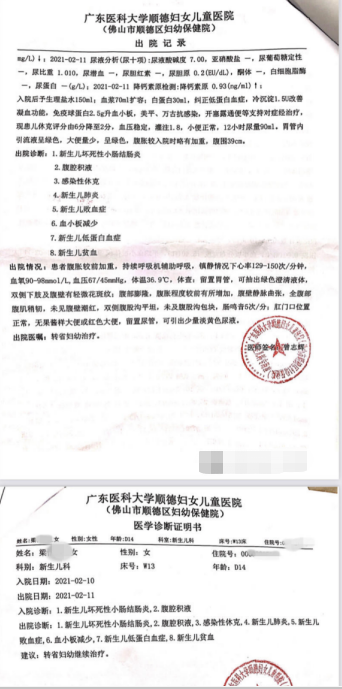广东医科大学顺德妇女儿童医院(佛山市顺德区妇幼保健院)出具的诊断证明显示,梁女士出生14天的女儿已出现新生儿坏死性小肠结肠炎、腹腔积液、感染性休克等症状,患有新生儿肺炎、新生儿败血症、血小板减少,新生儿低蛋白血症,新生儿贫血。