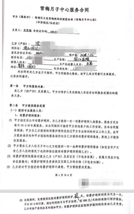 梁女士告诉红星新闻,双方签订合同之前,月子中心的销售告诉她说,入住后,月子中心每天都会观察宝宝的健康情况,如果身体有异常,会及时提示家属,就医也会及时安排,能够最大限度保障宝宝健康。而最打动梁女士的,也是月子中心最突出的服务,即可以提供月嫂一对一服务,避免集中护理可能产生的交叉感染。