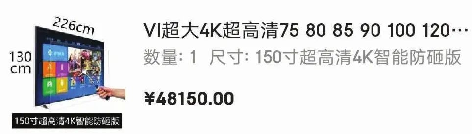我回家后仔细查看发现,电视外包装箱上标注的“150英寸”产品标识,只是一张A4纸打印后贴上的,并不像正规家电的产品标识。我拿尺丈量后发现,这款电视长226厘米、宽130厘米,对角线长260厘米,正好是100英寸电视的尺寸。我了解到,150英寸电视的标准尺寸应该是长332厘米、宽186厘米,对角线长380厘米,或者长305厘米、宽228厘米,对角线长380厘米。我买的这款150英寸电视与这个标准尺寸相差悬殊,屏幕面积仅为标准尺寸的一半。
