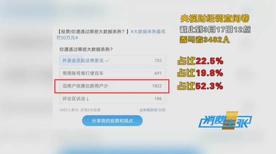 央视财经的调查显示,3482位参与者中,有783人遇到过外卖会员配送费更高的现象,占比22.5%,有691人遇到过常用账号难打便宜车的情况,占比19.8%,有1822人认为旧用户优惠比新用户少,占比52.3%。可见,大数据杀熟已经成为我们的日常生活中非常普遍现象。