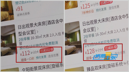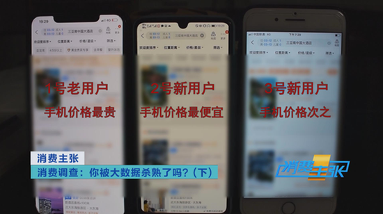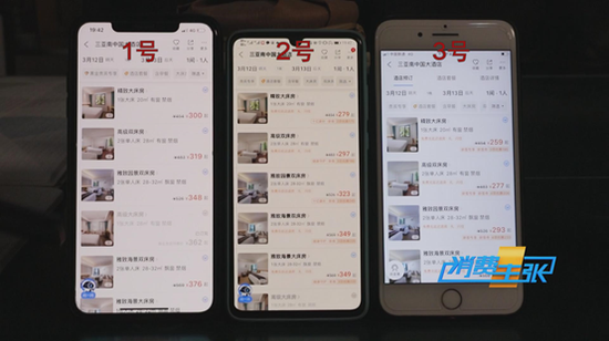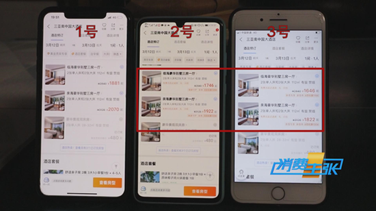 “1号是经常住南中国大酒店,但是在1号手机上,我们发现所有房型的价格全部都高于2号和3号手机,而且这三部手机的房型价格,全部都不一样。”