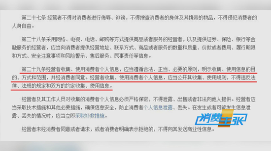 中国法学会消费者权益保护法研究会副会长兼秘书长、中国人民大学法学院教授刘俊海指出,《中华人民共和国消费者权益保护法》第二十九条规定:经营者收集、使用消费者个人信息,应当遵循合法、正当、必要的原则,明示收集、使用信息的目的、方式和范围,并经消费者同意。经营者收集、使用消费者个人信息,应当公开其收集、使用规则,不得违反法律、法规的规定和双方的约定收集、使用信息。
