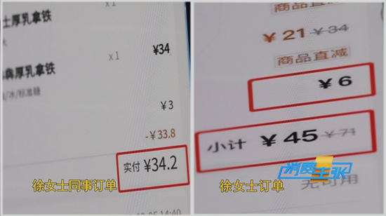 “我的同事点了两杯瑞幸咖啡,就是34元钱。我也点一下那个咖啡,但是我的支付金额应该是45元钱的样子,比朋友的价高了10元钱。”