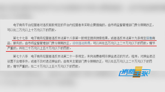 第七十七条规定:电子商务经营者违反本法第十八条第一款规定的,或者违反本法第十九条规定搭售商品、服务的,由市场监督管理部门责令限期改正,没收违法所得,可以并处五万元以上二十万元以下的罚款;情节严重的,并处二十万元以上五十万元以下的罚款。