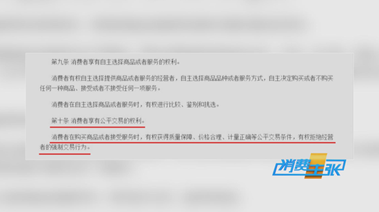 第十条规定:消费者享有公平交易的权利。消费者在购买商品或者接受服务时,有权获得质量保障、价格合理、计量正确等公平交易条件,有权拒绝经营者的强制交易行为。