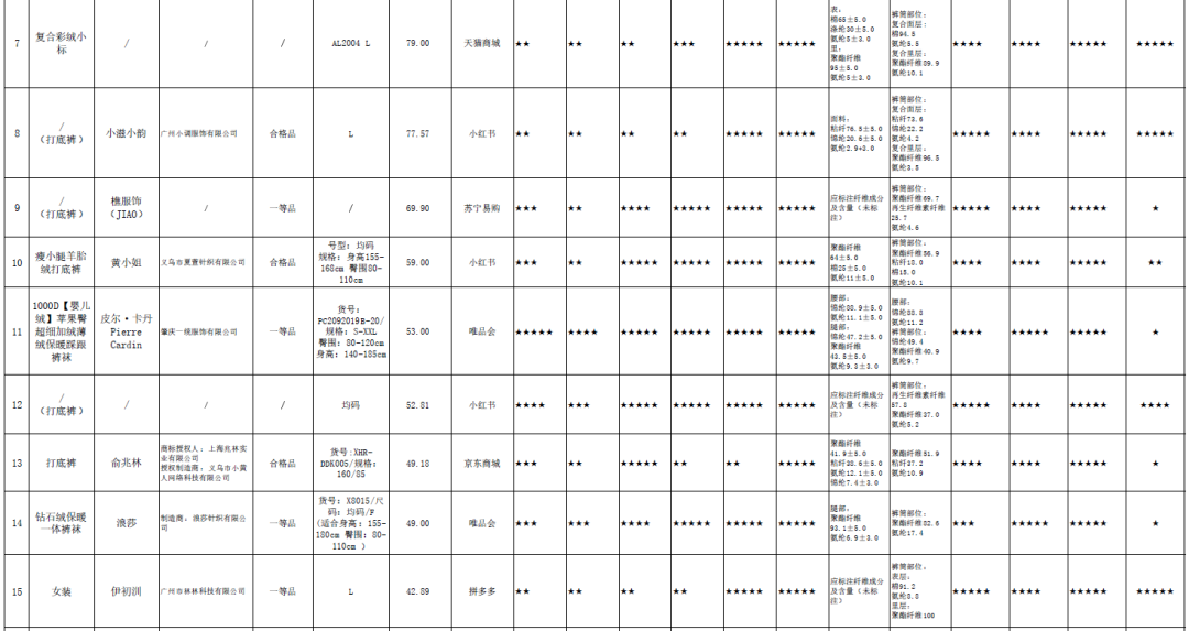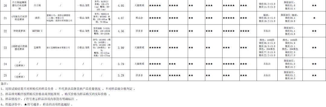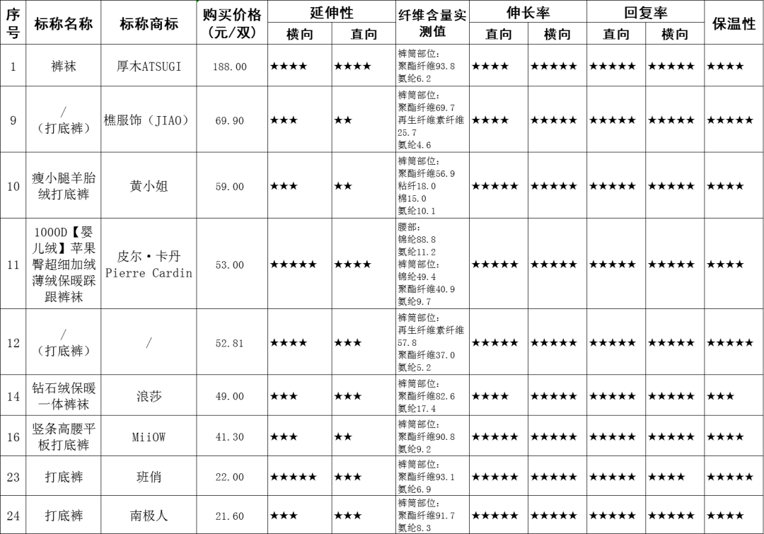连裤丝袜和打底裤产品比较试验结果