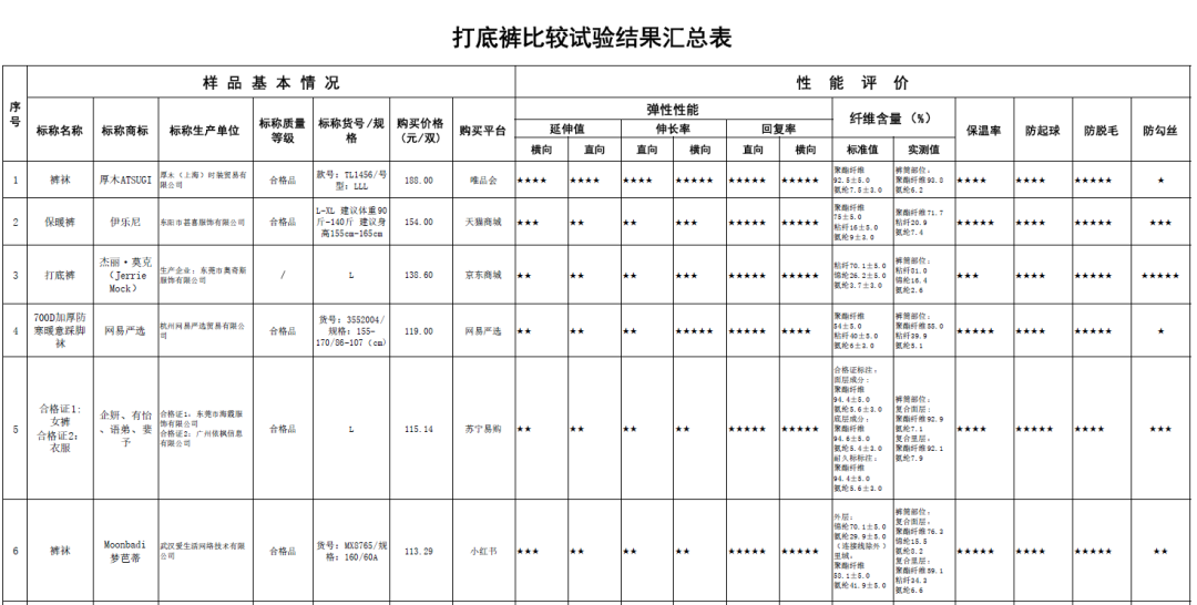 打底裤比较试验结果汇总表