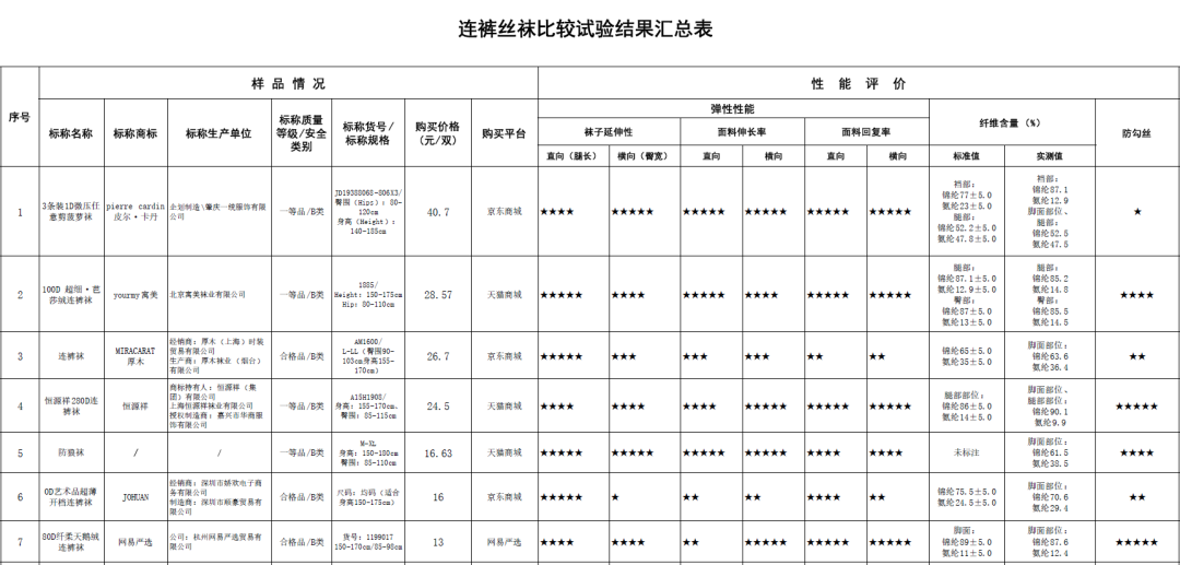 连裤丝袜比较试验结果汇总表