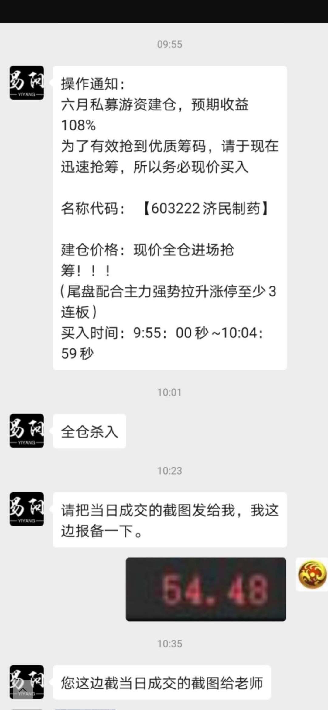“60322 济民制药,现价全仓随我一同抢筹买入,10分钟后拉涨停!”——在这样有煽动性的语言下,有20多年炒股经验的杨先生以54.45元的价格在11日买入了近4万股济民制药,耗费资金超200万元。