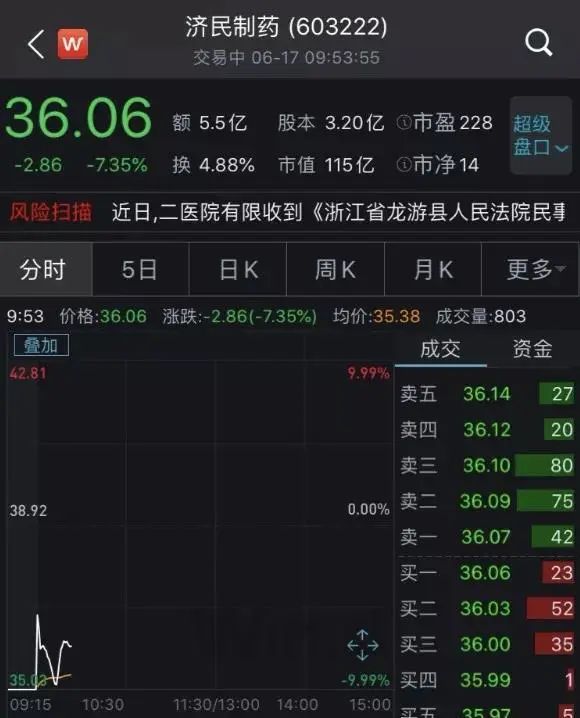 今天,济民制药以跌停价开盘,股价在短暂拉高后继续走低,截至发稿,跌幅超7%,这也意味着像杨先生这样的投资者损失还在扩大。