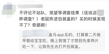 浦东新区市场监管局已要求涉事企业立即开展全面自查,加强食品安全管理,并将联系消费者,对涉事产品进一步调查。同时,通报盒马中转仓属地监管部门,对相关情况进行调查处理。