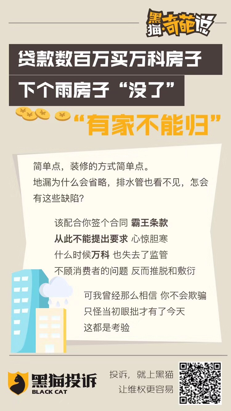 A先生花尽家中积蓄外加贷款数百万,在房价还没如今这般夸张时买了万科房子,本想就此过上舒心的生活,不料,2017年6月8日-9日一场特大暴雨后,雨水经过房屋阳台倒灌入室内,家中一片汪洋,A先生与开发商万科沟通,其表示这是由于地漏堵塞、排水不畅所致,出于 “公司关怀”,可以考虑维修,前提是签订霸王条款:不能再提任何要求、不能泄密等。