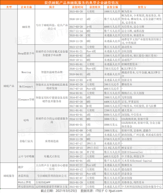 根据IT 桔子数据显示,IT 桔子数据库共计收录 152 家与睡眠产品、睡眠服务相关的企业。其中,睡眠创业市场中共计有超过 35 家企业有获得过融资。